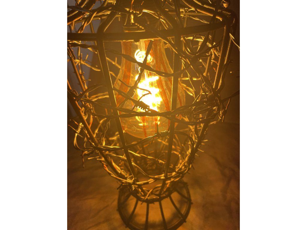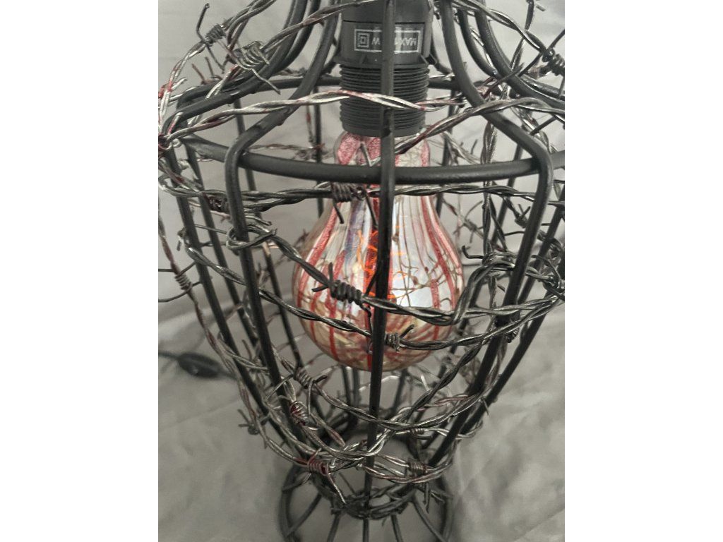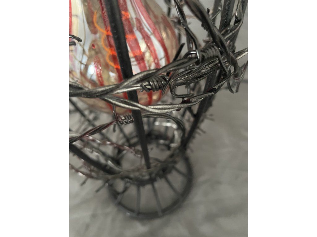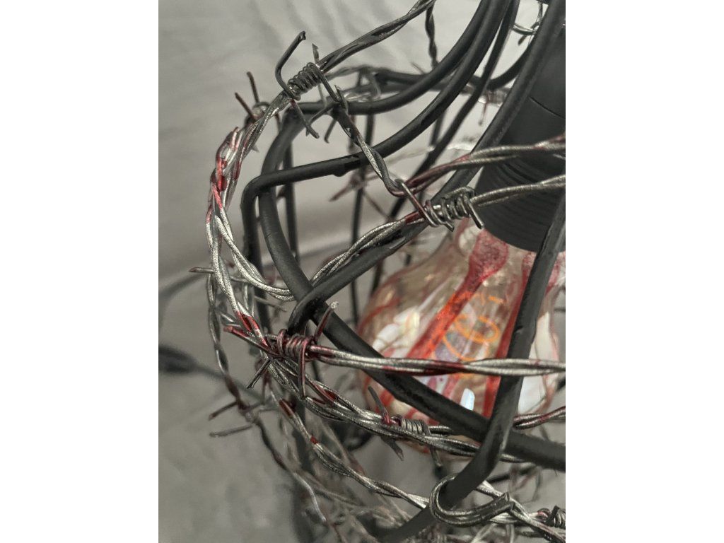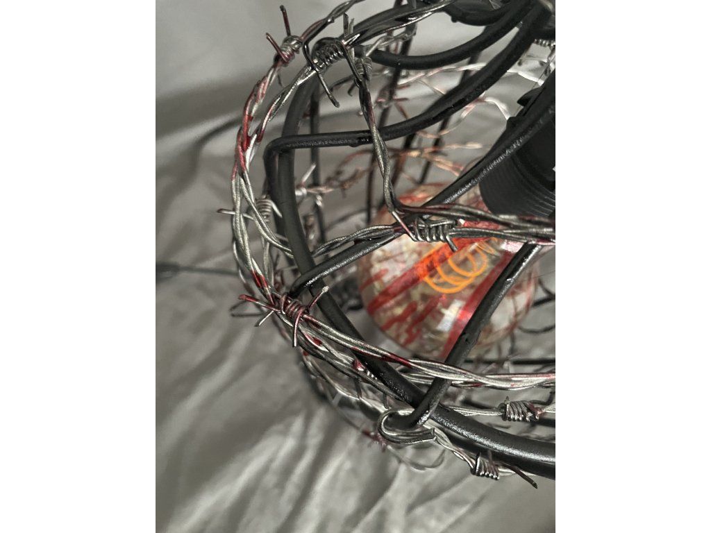 Uvnitř se nachází žárovka se stopami červené barvy, evokující krev stékající po skle — jako by světlo bylo uvězněno a pomalu prosakovalo ven.