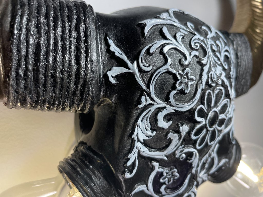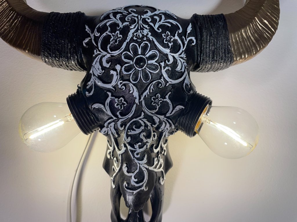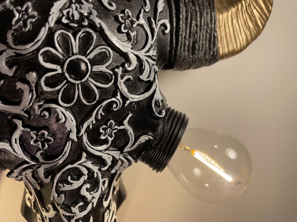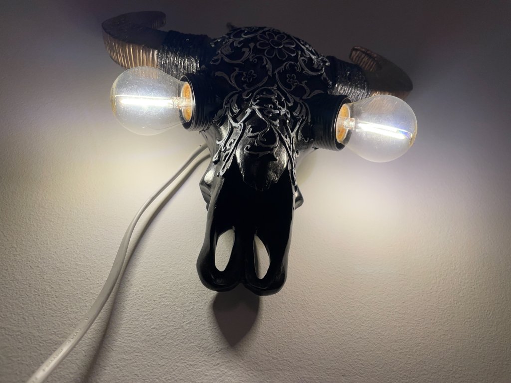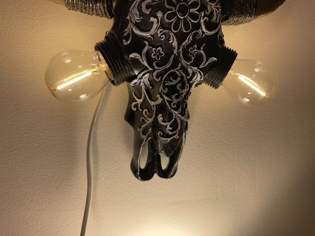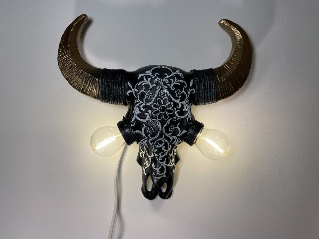 Tato originální nástěnná lampička vznikla z modelu zvířecí lebky, která byla ručně upravena a zdobena ornamentálními motivy. Místo očí jsou vsazeny žárovky, jež se stávají hlavním výrazovým prvkem celého objektu a dodávají mu intenzivní, téměř rituální charakter.