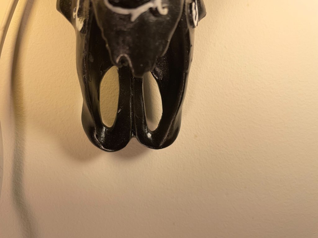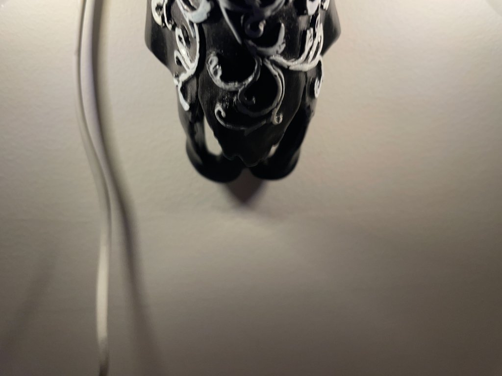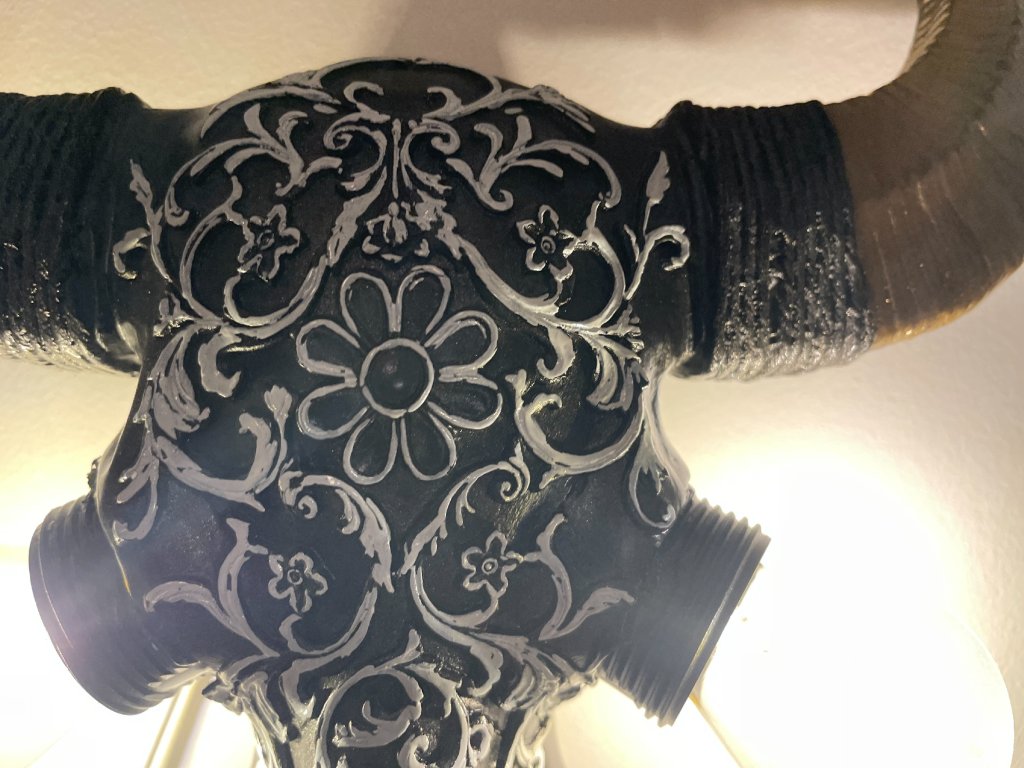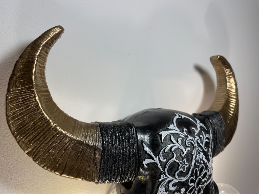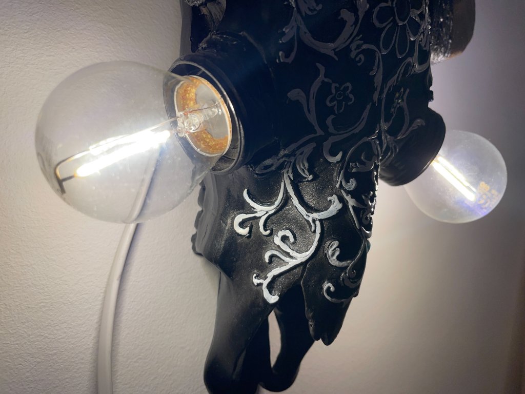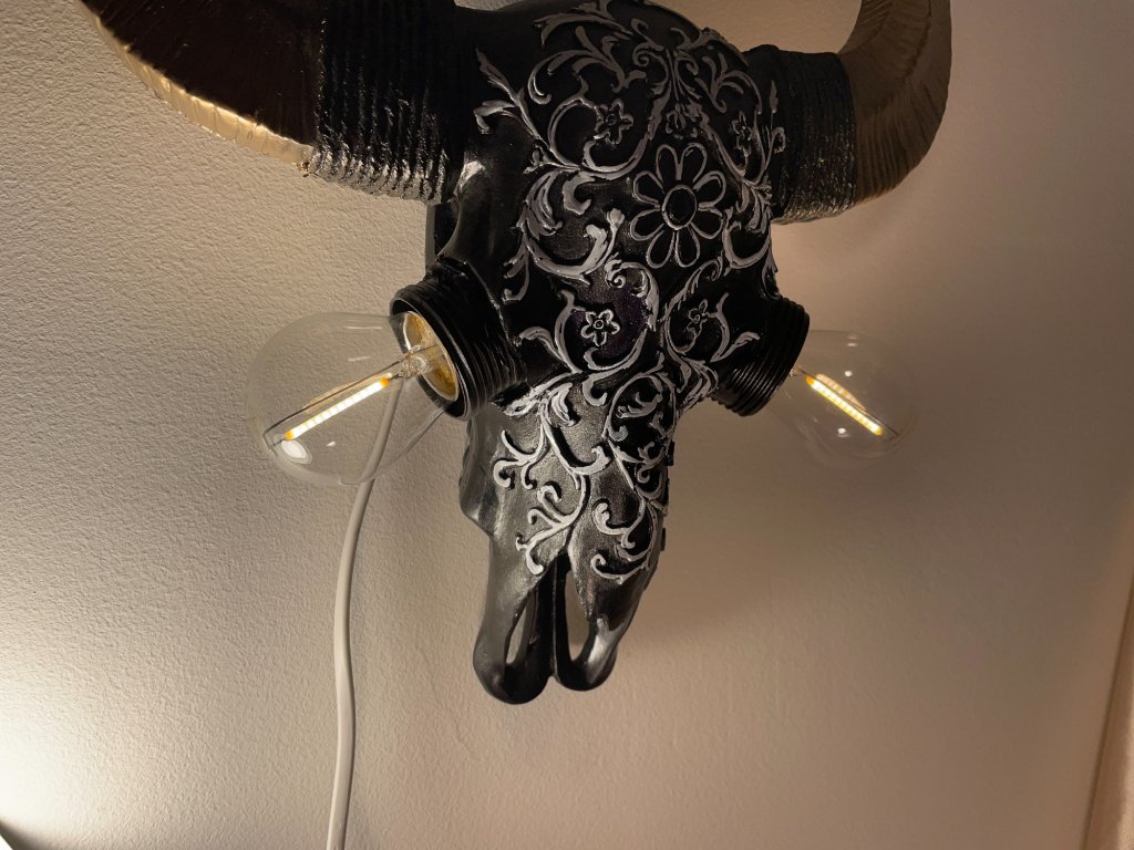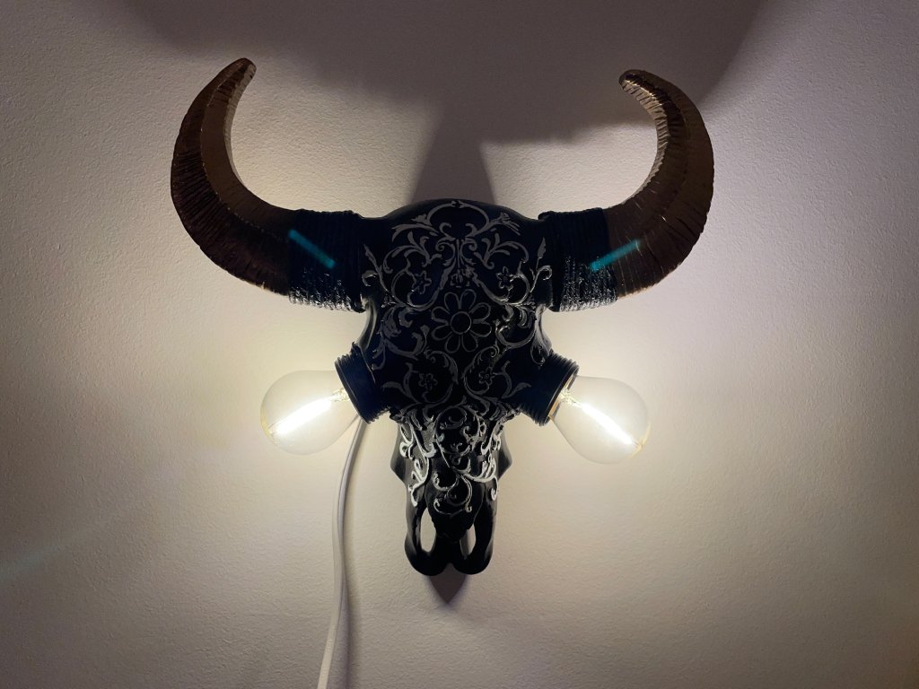 Tato originální nástěnná lampička vznikla z modelu zvířecí lebky, která byla ručně upravena a zdobena ornamentálními motivy. Místo očí jsou vsazeny žárovky, jež se stávají hlavním výrazovým prvkem celého objektu a dodávají mu intenzivní, téměř rituální charakter.